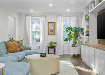 In collaboration with Haven South Designs, we transformed this first floor into a serene retreat that truly reflects the homeowners’ style. We began by removing the outdated, wall-to-wall built-ins that overpowered the living room. In their place, we installed a custom media wall featuring beautifully crafted oak shelving on each end and storage cabinets below. At the center of the design, a striking white oak slat paneling serves as a backdrop for the TV, perfectly stained to match the newly refinished floors, bringing warmth and texture to the space.